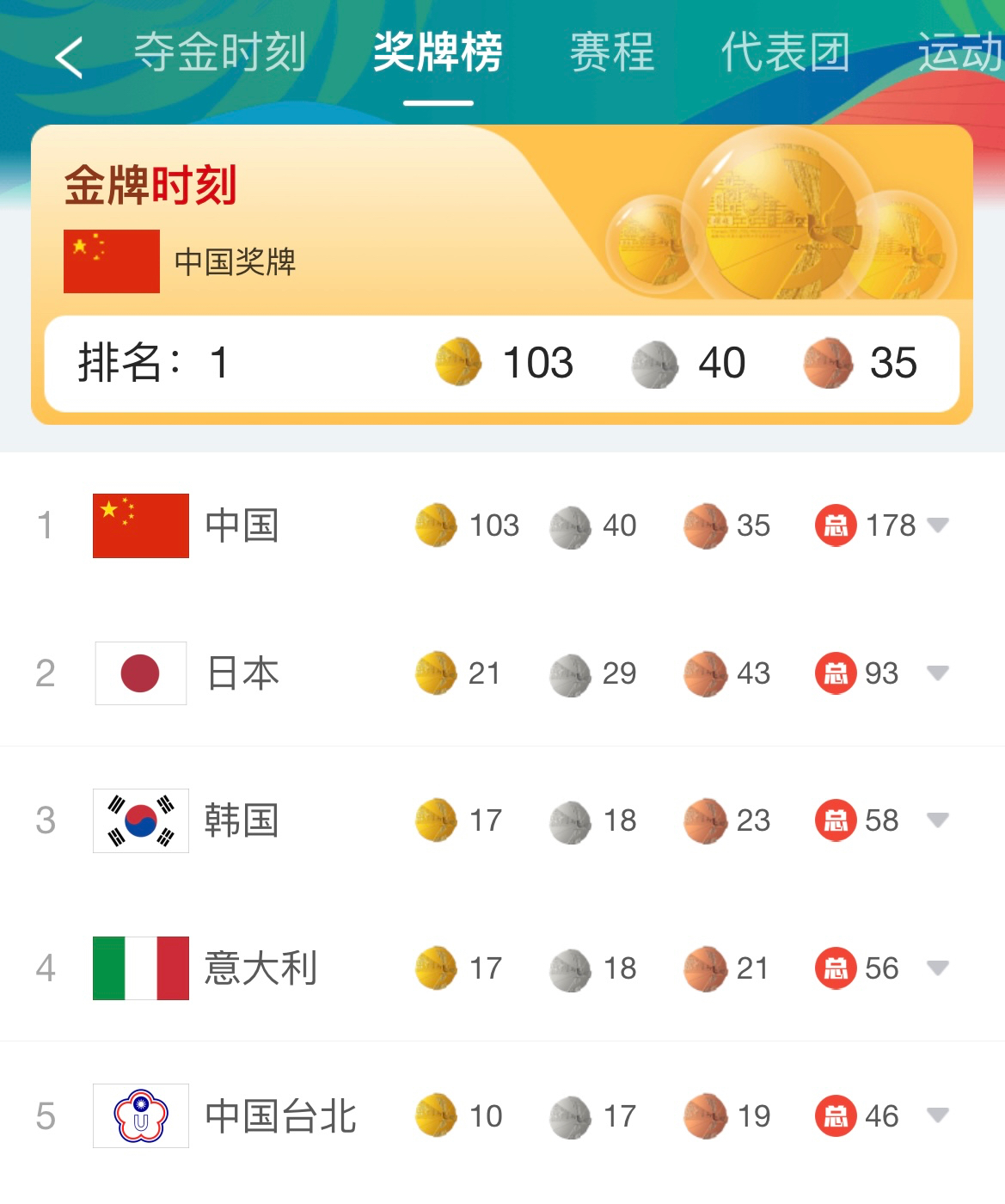 本届世界大学生夏季运动会,中国以103枚金牌,40枚银牌,35枚铜牌,总奖牌178枚的成绩遥遥领先,位列金牌榜和总奖牌榜第1位,金牌数和奖牌数均创历史新高,创造了大运会历史最佳战绩!赛场上,运动健儿们传递激情和梦想、展示勇气和力量,让所有人感受到运动员无与伦比的风采,中国健儿更是在挑战自我中创造奇迹,创造大运佳绩。